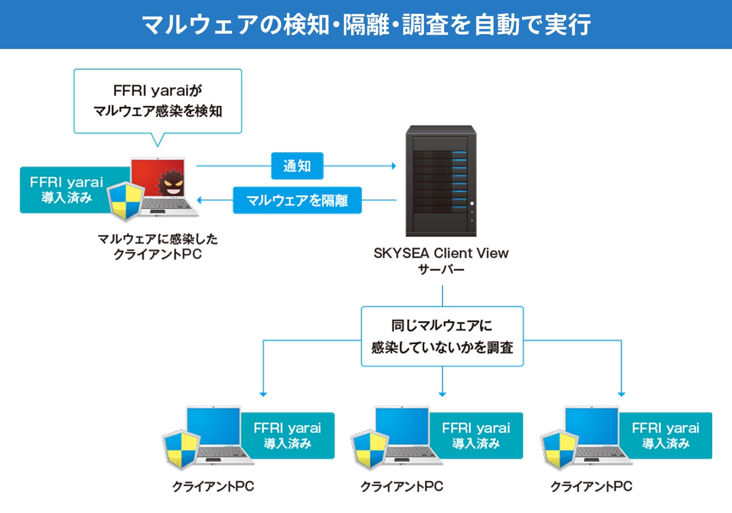 さらに、優れた検知能力を持つエンドポイントセキュリティ「FFRI yarai」との連携機能もご用意。PCに常駐した「FFRI yarai」が怪しいふるまいを基に未知のマルウェアを検知し、「SKYSEA Client View」が検知したマルウェアを隔離します。また、ほかのPCに同様のマルウェア感染が起きていないか自動で調査します。