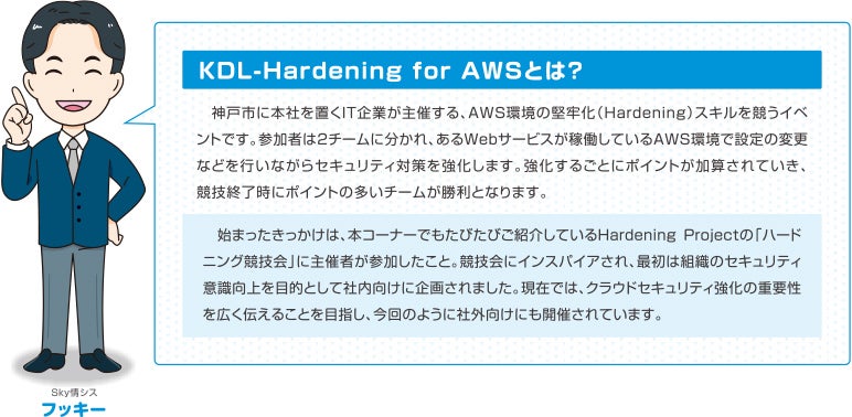 Sky株式会社の情報システム部は「お客様に安心して弊社商品をご利用いただくことに自分たちも貢献したい」と、技術力向上のため外部イベントにも積極的に参加しています。今回報告するのは、「KDL-Hardening for AWS」。今や多くの企業で利用されているAWS(Amazon Web Services)のスキルは、セキュリティに関わる者として身につけておきたい……ということで、情シス・フッキーが完全プライベートで参加してきました!