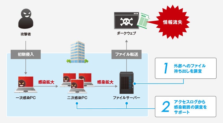 サイバー攻撃が確認された場合、被害を最小化し再発を防ぐためには、速やかにその全容を明らかにすることが重要です。今回は、組織のネットワークに侵入し、侵入先にある既存ツールを悪用してファイルを窃取する攻撃手法を一例に、各プロセスの調査をSKYSEA Client Viewのログで支援する方法を解説します。