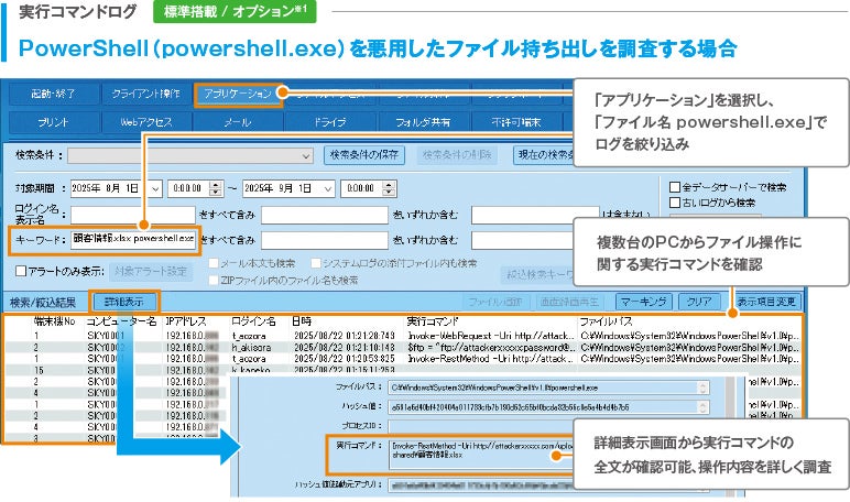 各種セキュリティ製品やシステム管理者の調査によって流出ファイルが特定されている場合、そのファイル名を基にファイル持ち出しの痕跡を調査できます。SKYSEA Client Viewのログでは、PowerShellやコマンドプロンプトで実行されたコマンドを確認可能。例えば、通常の業務シーンでは考えづらい、PowerShellを用いたファイル操作が複数台のPCから発見できた場合、ファイル持ち出しに関する怪しい挙動として考えられ、その後の調査材料として活用できます。