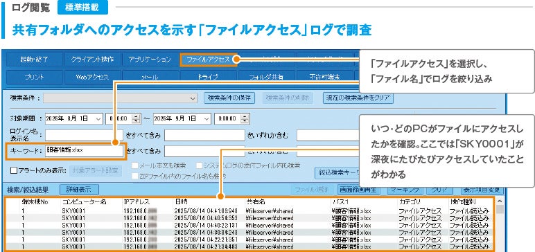 流出したファイル名を基にログを絞り込むことで、いつ・どのクライアントPCが当該ファイルにアクセスしていたかなど、ファイルに対する操作を細かく調査できます。例えば、業務時間外の深夜にアクセスしていたり、短時間のうちに大量にアクセスを行っていた場合は不審な挙動と見なされ、その操作を行ったPCはマルウェア感染が疑われるなどの判断材料になります。