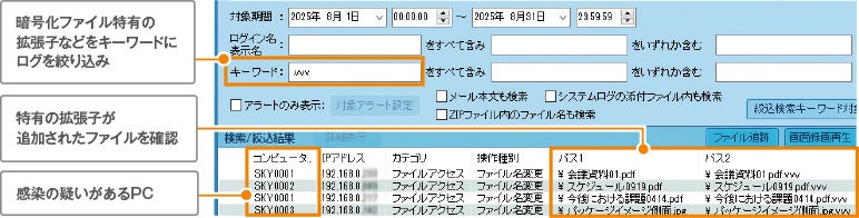 もし、ランサムウェアによるファイル暗号化の被害に遭った場合に、暗号化されたファイルの特徴(拡張子など)を基にログを絞り込むことで、影響範囲の調査が可能。ランサムウェア感染が疑わしいサーバーやPCの洗い出しに活用いただけます。