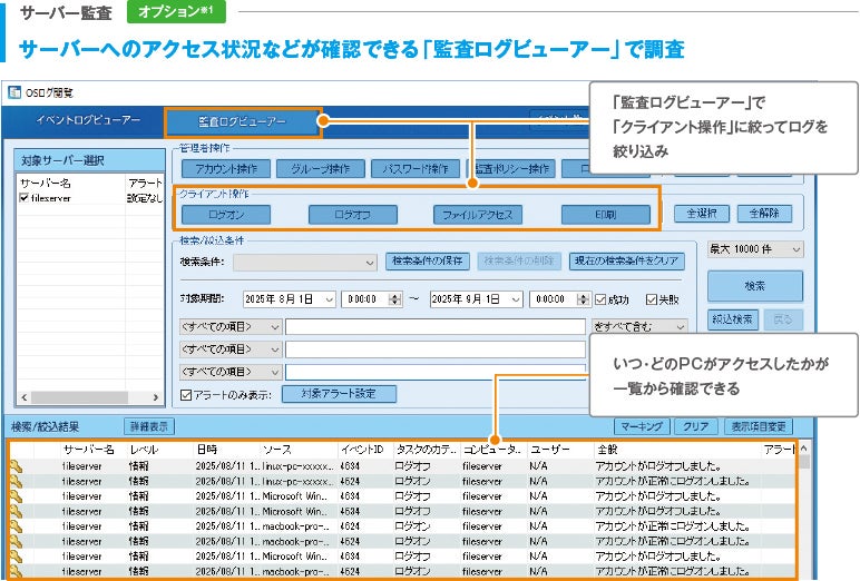 前述でご紹介した「ファイルアクセス」ログは、MacやLinuxを搭載したクライアントPCに対しては収集できません。しかし、「サーバー監査」機能を使用することで、それらのPCによるサーバーへのアクセス状況やファイルの取り扱い状況を調査できます。Windowsサーバー上で発生した監査ログを収集し、専用画面で確認できる本機能を用いることで、各種PCがいつアクセスしたかを確認できます。