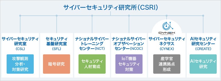 そうですね。サイバーセキュリティ研究所 【図1】 は、CYNEXのほか2つの研究室と、人材育成やIoT機器のセキュリティ対策向上等を推進する4つのセンター、それら全体を支援する総合企画室を擁する組織です。多種多様なサイバー攻撃からわが国を守るため、NICTの中立性を活かし、産学との緊密な連携によりサイバーセキュリティ研究開発の世界的中核拠点を目指しています。