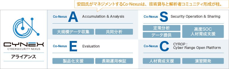 はい。全体のマネジメントを担っています。CYNEXアライアンスは、Co-Nexus(コネクサス)という4つのサブプロジェクトで構成されるアライアンスです。対応範囲が広く、それぞれにチェアがいます。Co-Nexus Aの主な活動は、STARDUST、WarpDriveという2つのデータ収集基盤を軸に国内の解析者コミュニティを形成することです。このチェアは私も担当しています。他のCo-Nexusもそうですが、各Co-Nexusが自立的に活動してもらうために、それぞれNICTの職員と外部の有識者の方の複数人がチェアを務める体制としています。