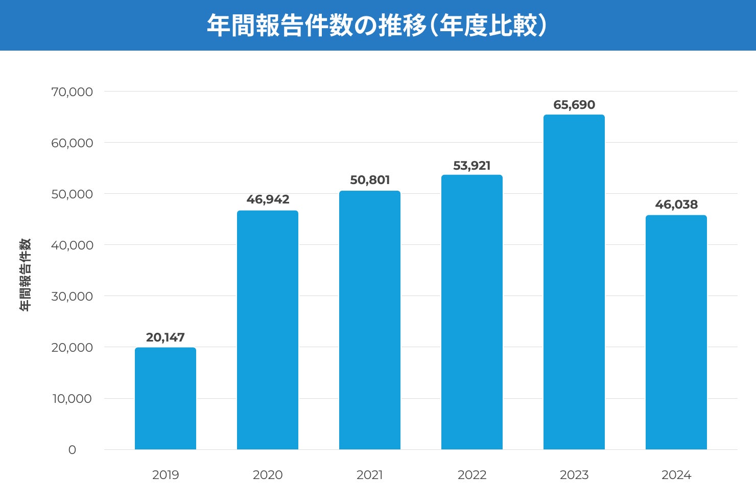 サイバー攻撃は増え続けており、それに伴ってセキュリティインシデントの数も増加傾向にあります。「一般社団法人JPCERT コーディネーションセンター(JPCERT/CC)」が2025年4月に公表した「インシデント報告対応レポート」によると、2023年度のインシデント報告件数は6万件を超えており、近年は非常に高い水準で件数が推移していることがわかります。