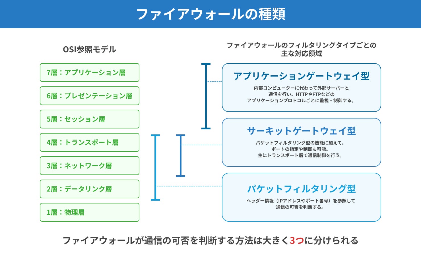 ファイアウォールが通信の可否を判断する方法は、「パケットフィルタリング型」「サーキットゲートウェイ型」「アプリケーションゲートウェイ型」と、大きく3つの種類に分けられます。ここでは、それらの仕組みについて詳しくご紹介します。
