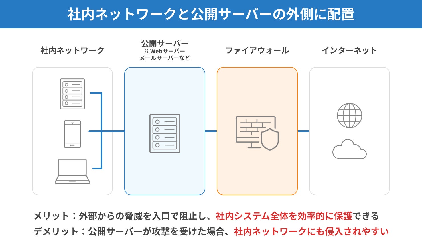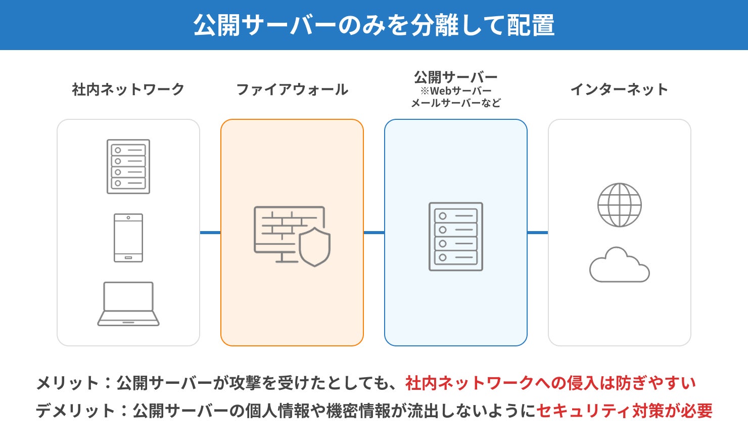 しかし、万が一公開サーバーが攻撃を受けた場合、内部ネットワークにも侵入されやすいというデメリットがあり、社内ネットワーク全体に危険が及ぶ可能性があることには注意が必要です。