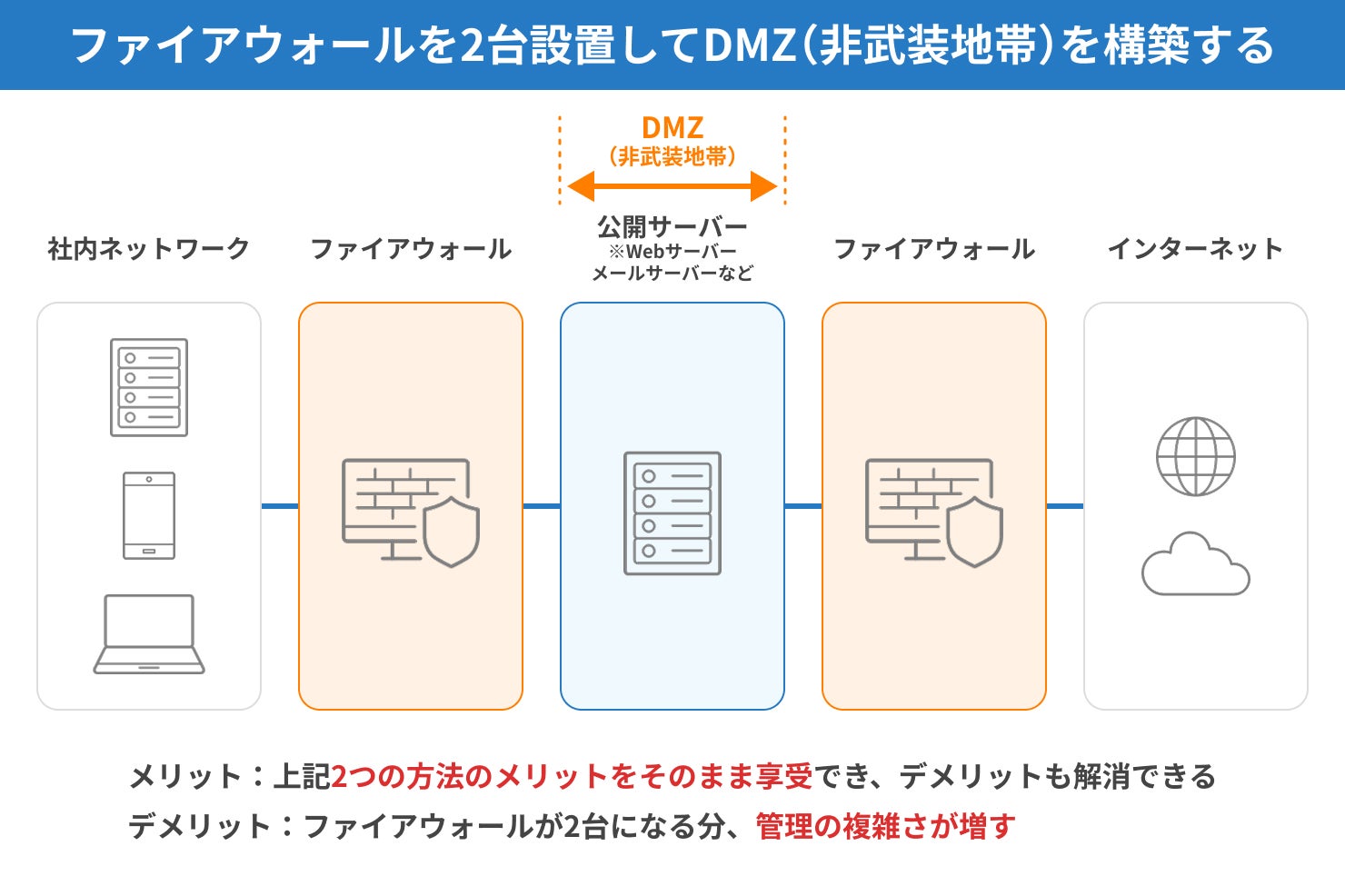 ファイアウォールが2台になる分、管理の複雑さは増しますが、公開サーバーを保護しつつ、社内から公開サーバーへのアクセスも容易という点は大きなメリットといえます。また、1台目が突破された場合でも2台目が侵入を阻止するなど、社内ネットワークをより強固に保護できることもメリットです。