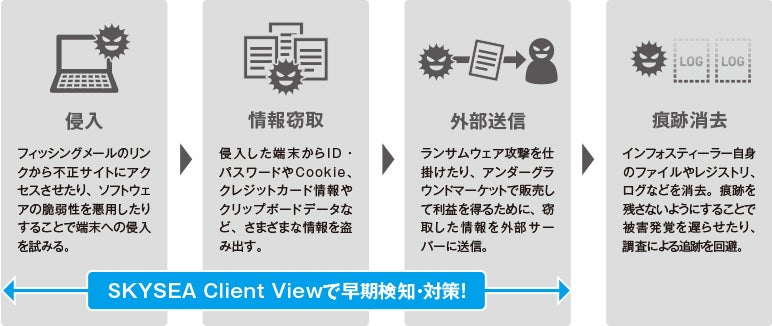 インフォスティーラーは一般的に、「侵入」→「情報窃取」→「外部送信」→「痕跡消去」というプロセスで攻撃を行います。「痕跡消去」まで進むと、インフォスティーラーは自身のファイルやレジストリなどを消去してしまうため、被害に遭った企業・組織は事後調査が困難になり、被害範囲の特定や再発防止策の検討が行えなくなる可能性も……。そのため、できる限り早い段階でその攻撃を検知し、被害を最小化することが重要です。SKYSEA Client Viewは、「侵入」「情報窃取」「外部送信」の各プロセスにおいてリスクを軽減し、多層防御による効果的な対策をサポートします。