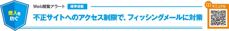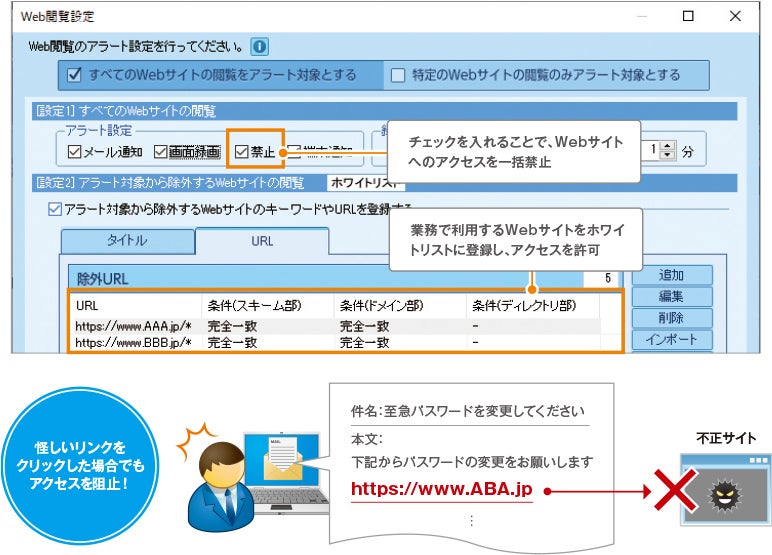 SKYSEA Client Viewの「Web閲覧」アラートを用いて、業務で利用するWebサイトのみアクセスを許可し、そのほかのWebサイトへのアクセスを禁止するように設定。これにより、不正サイトに誘導するフィッシングメールのリンクをクリックしてしまった場合でも、アクセスを防ぐことができます。
