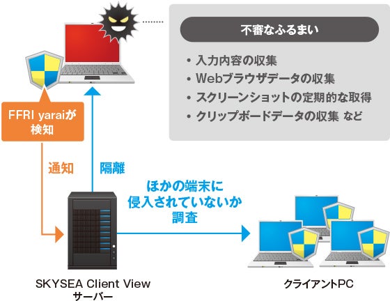 キーボードの入力内容(ID・パスワードなど)や、CookieなどのWebブラウザに保存されたデータを収集したり、スクリーンショットを定期的に取得するインフォスティーラー。「EDRプラスパック」では、これら情報窃取につながる端末上のふるまいを次世代エンドポイントセキュリティ「FFRI yarai」が自動で検知。同時にSKYSEA Client Viewが当該端末を隔離し、脅威の発見と被害の拡大防止をサポートします。
