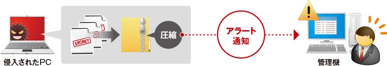 インフォスティーラーは、窃取した情報を効率的かつ迅速に持ち出すために、PC上でデータを圧縮してから外部送信するケースがあります。SKYSEA Client Viewでは、PC上で圧縮ファイルが生成された際、管理者にリアルタイムで通知し、圧縮ファイルを自動的に削除。被害の早期把握と情報持ち出しの未然防止を支援します。