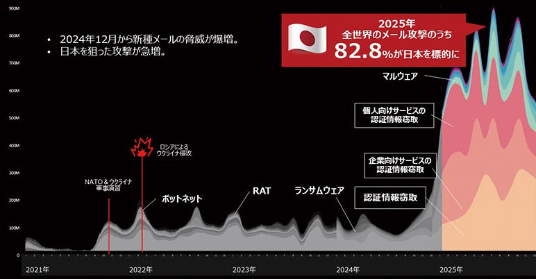 メールの脅威については、当社が公開している統計データを見ると、地政学的な緊張や対立の影響を受けていることがよくわかります。2022年にロシアがウクライナに侵攻した際には一気に増加しました。以降、ほぼ下がっていません。すでに、侵攻前の2021年に行われたNATOとウクライナの軍事演習のタイミングから増加していたことも、このデータからわかります。