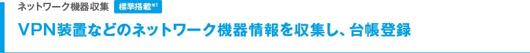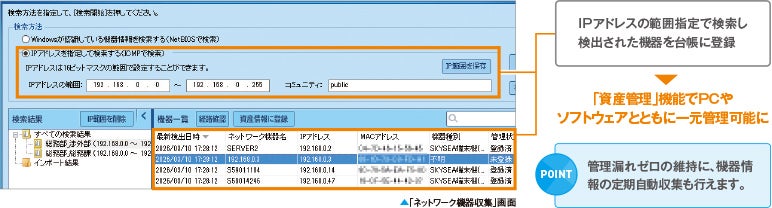 SKYSEA Client Viewの「ネットワーク機器収集」機能は、エージェントがインストールされたPCやソフトウェアの情報を自動収集するだけでなく、組織のネットワークにつながるVPN装置などの情報も収集。台帳に登録することで網羅的に管理できます。
