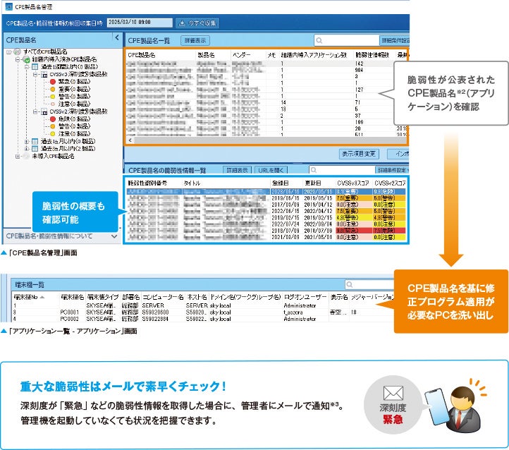 ※2 ハードウェアやソフトウェアなどを識別するための名称の基準。JVNで公表される脆弱性情報に含まれ、SKYSEA Client Viewの管理下にあるソフトウェアの情報とひもづけるために用いられます。