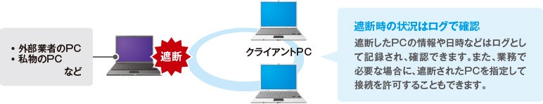 SKYSEA Client Viewでは、許可していないUSBデバイスの使用を禁止できるほか、台帳に登録されていないPCがネットワークに接続された際に自動で遮断することができます。これらの機能により、持ち込みデバイスやPCの無断使用を防ぎ、組織内に脅威が持ち込まれるリスクを軽減します。