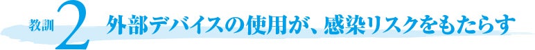 外部業者がメンテナンスのために持ち込んだUSBメモリなど、組織が把握しきれないデバイスはマルウェア感染などのリスクを伴います。このリスクを考慮し、使用できるUSBメモリを限定したり、管理外のPCを接続させないことが必要となります。