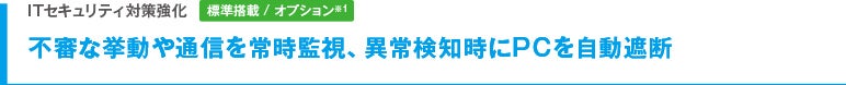 インシデント対応の成否は、脅威を検知してから封じ込めるまでの初動にかかっています。この時間を短縮するアプローチが“検知と対応の自動化”です。「ITセキュリティ対策強化」機能は、連携するウイルス対策ソフトウェアやUTM、次世代ファイアウォールの感染検知をきっかけに、該当PCを自動で遮断。マルウェアに感染拡大の猶予を与えることなく、被害を最小限に抑えます。