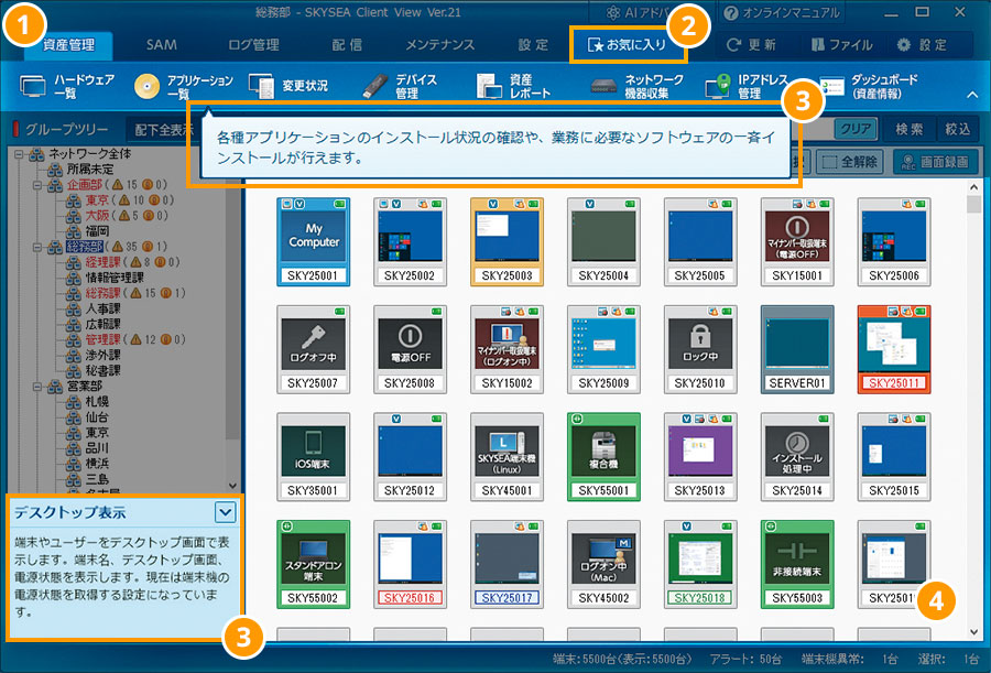 各PCのデスクトップ画面の様子や各種設定、アラート発生の状況を部署ごとに一覧で確認できます。アラートを種別ごとに色分けして表示し、分類しやすくすることも可能です。