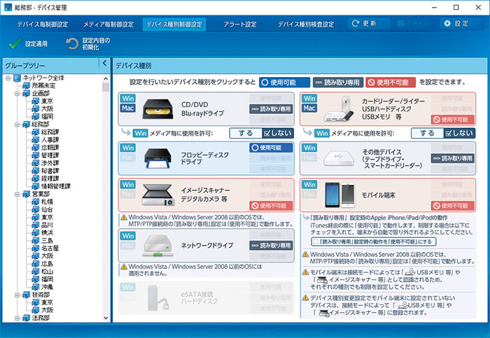 アイコンをクリックして切り替えるだけでデバイスの使用制限が可能。複雑な操作なしで運用を開始できます。
