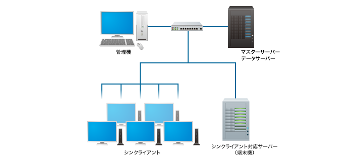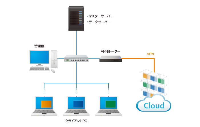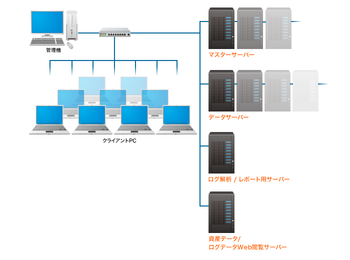 - マスターサーバー、データサーバーともに、1台あたり5,000クライアントまで管理できます。画面操作録画機能<オプション(Ent / Pro / Tel / LT / 500 / ST)>でクライアントの常時録画を行う場合は、データサーバー1台あたり150クライアントまでとなります。