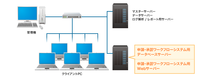 クライアントPCやソフトウェアなどのIT資産の利用申請および承認のワークフローを、Webシステムで運用する「申請・承認ワークフローシステム」オプションのための構成です。Webシステム専用のサーバーを設置します。