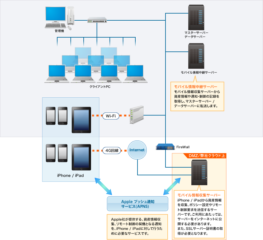 「MDM Services(A)」、「SKYSEA Client View for MDM」でiPhone / iPadの運用管理を実現するためのシステム構成です。社内外にあるiPhone / iPadとの通信を行うためのサーバーやデータを中継するサーバーを設置します。また、サーバーからiPhone / iPadに対する資産情報収集や、リモート制御通知などを行うために、Appleプッシュ通知サービス※2を利用します。