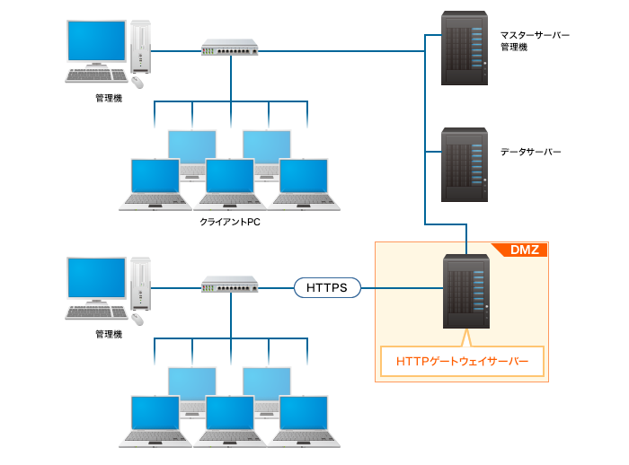 HTTPゲートウェイサーバー1台につきインターネット接続する端末5000台まで管理することができます。HTTPゲートウェイサーバーのマシンスペックについては、技術資料の「システム構成」をご確認ください。HTTPゲートウェイサーバーは、Windows ServerとLinux Serverに対応しています。対応OSの詳細は、技術資料の「OS 対応表」をご確認ください。