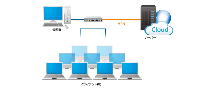SKYSEA Client Viewの各種サーバーをクラウド上に構築できます。物理サーバーの購入が不要なため、初期コストを抑えて導入できます。インターネット経由でのIT資産管理、ログ収集、ソフトウェア配布が可能です。